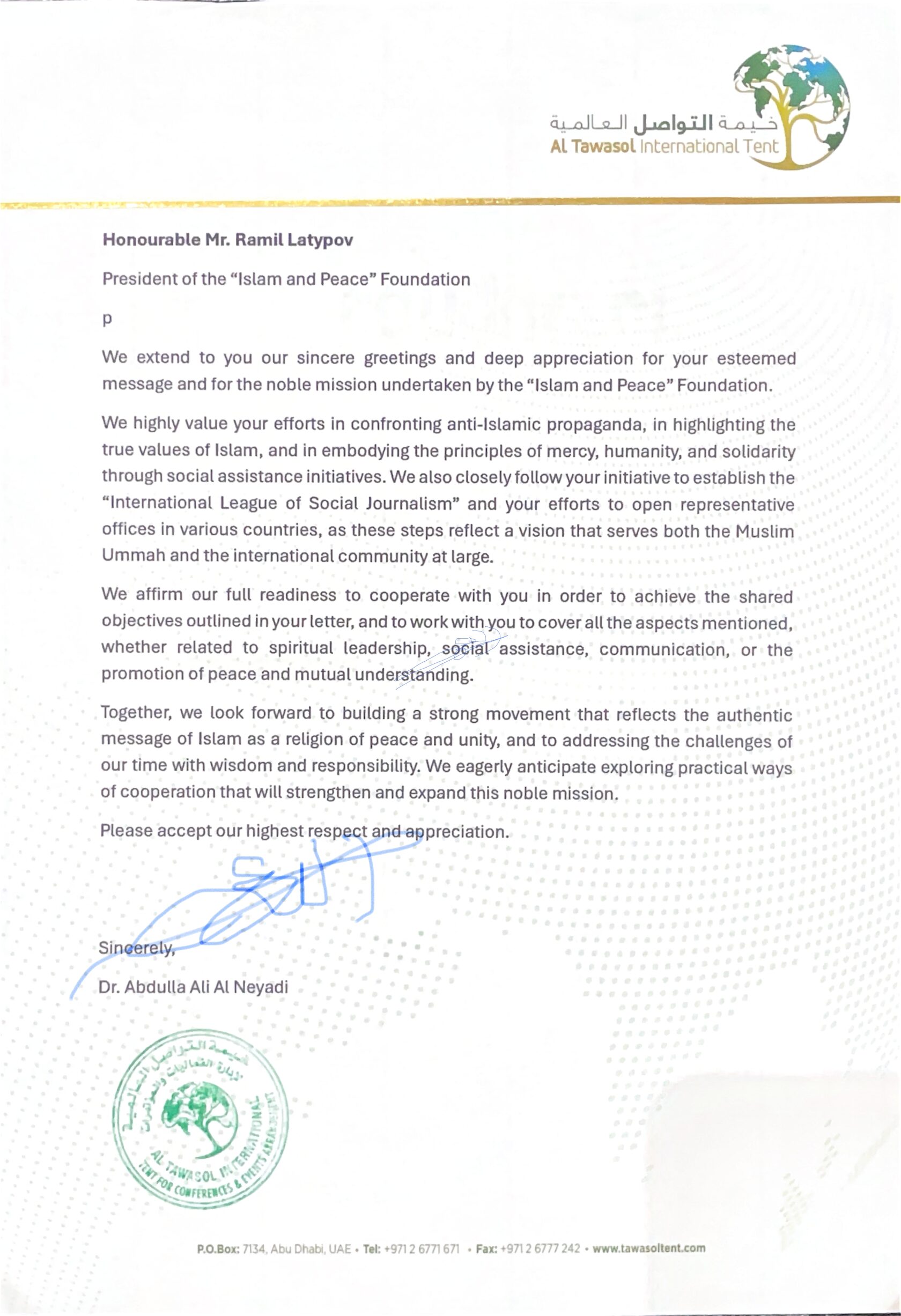 Letter from Dr. Abdullah Ali Al Neyadi to the President of the Islam and Peace Foundation
